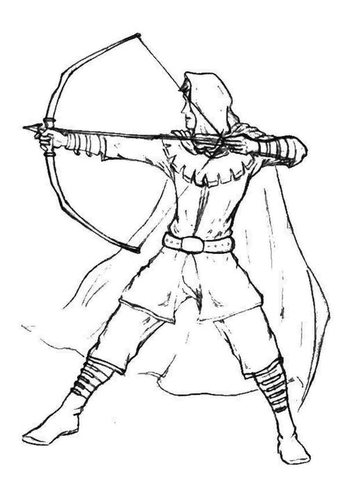 Продолжайте добавлять детали к рукам и ногам Робина Гуда. Нарисуйте длинные прямые линии для предплечий и бедер, а затем добавьте форму рук и ног.