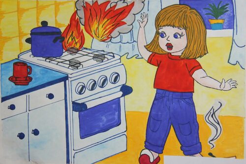 Четвертый рисунок показывает, как важно соблюдать правила пожарной безопасности в кухне. Дети узнают, что нельзя оставлять горящую плиту без присмотра и следует избегать надевания легкой одежды, которая может загореться. Также они узнают о необходимости использования пожарных тушителей в случае возникновения огня.