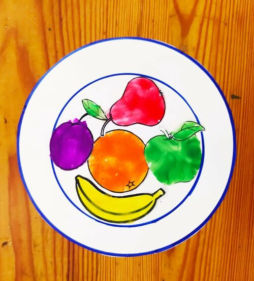Возьмите лист бумаги или картон и разместите его перед собой. Начните с нарисованной тарелки в центре листа. Выберите любимый цвет для тарелки и аккуратно нарисуйте ее контур.