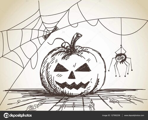 Тыквы - символ Хэллоуина. Нарисуйте круглую форму и добавьте ребра тыквы. Нарисуйте лицо - глаза, нос и рот. Вы можете добавить детали, такие как ручку тыквы или освещение изнутри. Этот рисунок легко нарисовать карандашом и затем раскрасить в яркие оранжевые цвета.